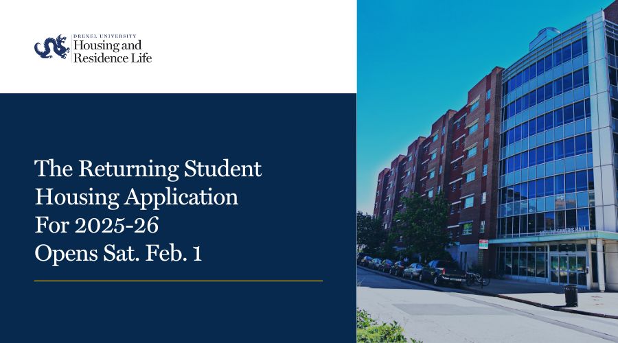 The Drexel Housing Application for returning students (rising sophomores and above) opens on Saturday, Feb. 1 to apply for housing Drexel residence halls and fraternity/sorority houses for the 2025-26 academic year. Returning students who apply by May 15 will have the $200 housing application fee waived! Students and families are invited to review the article “2025-26 Drexel Housing Options for Second-Year and Upper-Class Students,” which includes resources to help students of any class level make an informed housing decision. Additionally, Drexel Housing is hosting a webinar on Thursday, Jan. 23 at 7:30 pm EST specifically for current first-year (rising second-year students) who wish to better understand their residency options for their second year. For questions or assistance, please contact the Housing team at housing@drexel.edu.