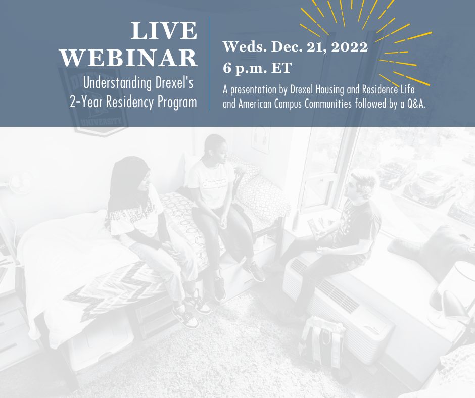 NEW SESSION DATE: Rising sophomores (2023-24 second-year students) and their families are invited to a virtual informational webinar on Weds. Dec. 21 at 6 p.m. ET, Understanding the 2-Year Residency Program, a presentation by Drexel Housing and Residence Life and American Campus Communities. Attendees will be able to ask questions in a Q&A following the presentation. Click here to register in advance for this webinar.